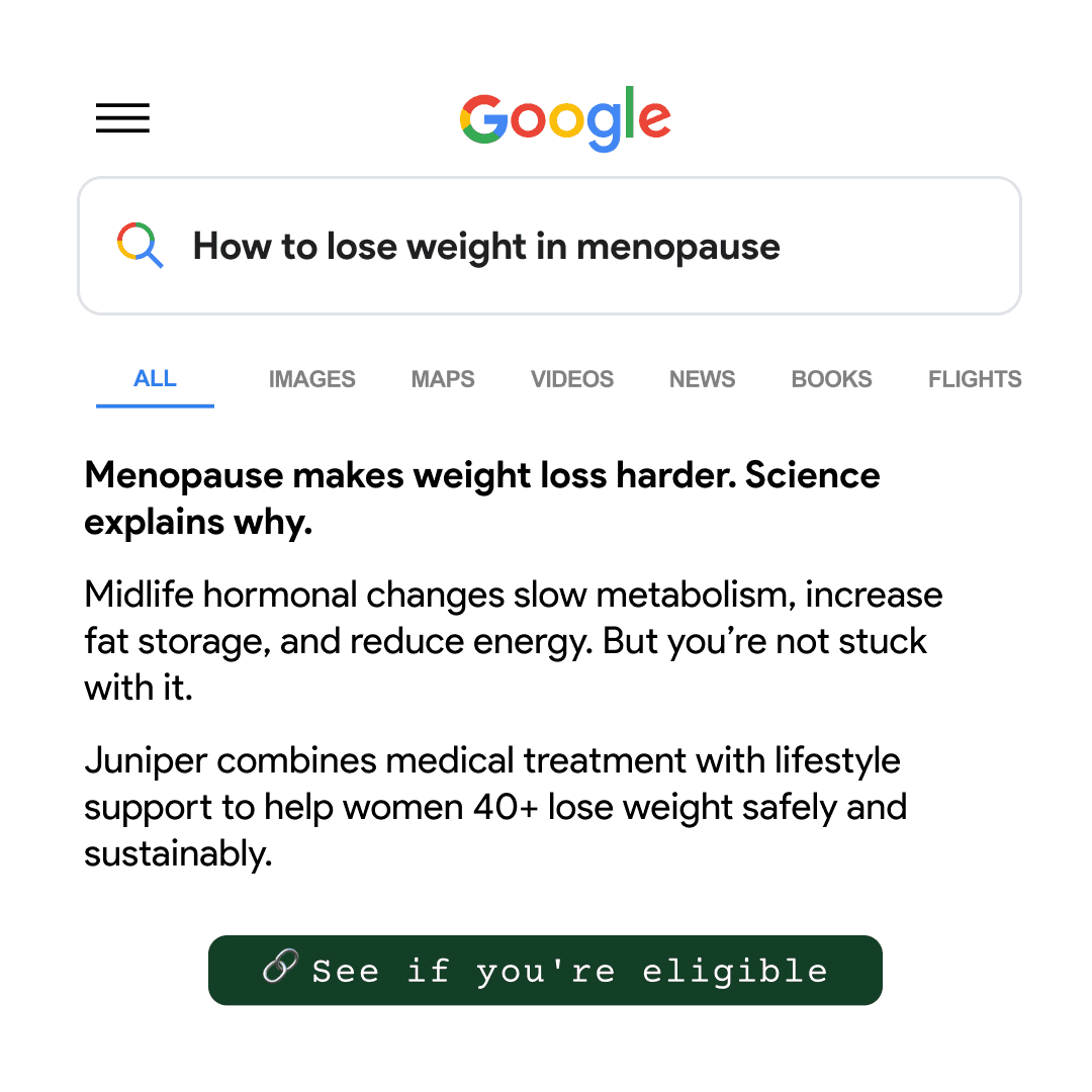 The Juniper program is designed to support women with science-backed weight loss solutions throughout all life's stages. With empathetic and empowering messaging, real patient testimonials, and education from healthcare professionals, we help women feel heard, seen, and empowered to choose a weight loss program that's built for their changing biology.