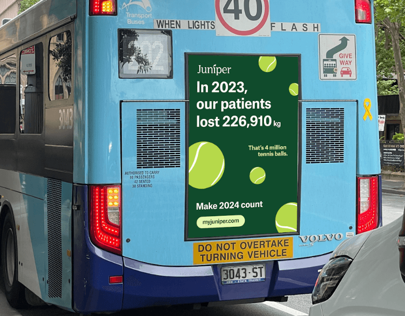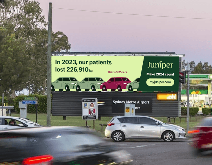 We harnessed the optimism of the New Year by shifting the conversation from unrealistic resolutions to sustainable change. By sharing the collective weight loss of Juniper patients that year, this awareness campaign celebrated real progress at scale — showing Australians that meaningful, lasting results are possible with the right support. Tied together with a 'Make 2024 count' tag line inviting others to join the movement.